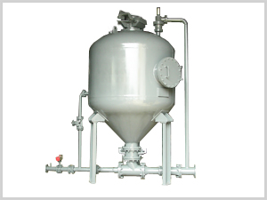 YJC系列倉泵的工作原理,同樣是運用流態(tài)化技術(shù)和氣力壓差原理來達到物料輸送目的,當物料進入泵體料滿后,關(guān)閉進料門,經(jīng)過氣化使物料形成流態(tài)化后,順利進入收容室,同時射流噴嘴高速噴出氣流,帶著物料經(jīng)過文氏管再次使氣物均化,進入輸送管道,即達到粉體物料的輸送目的,料氣分離,氣體經(jīng)布袋除塵器過濾后排入大氣。