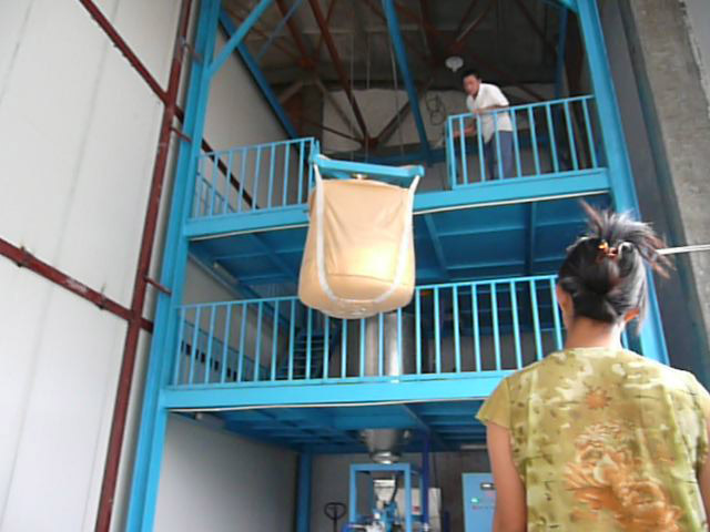 由于生產(chǎn)需要許多客戶需將大袋包裝物料拆分成小規(guī)格包裝,或?qū)Υ蟠锪线M(jìn)行卸料操作,本公司根據(jù)不同客戶的不同工藝要求設(shè)計出多種結(jié)構(gòu)的卸料分裝設(shè)備:對較小產(chǎn)量的分裝設(shè)備可選用本公司真空吸送設(shè)備,操作簡便靈活,設(shè)備投入少。對產(chǎn)量要求較高的分裝設(shè)備,我們根據(jù)用戶的物料特性和生產(chǎn)要求設(shè)計具體方案,主要結(jié)構(gòu)包括有液壓提升機(jī)構(gòu),集料受塵倉,物料輸送裝置,緩沖料倉,包裝機(jī)械等。